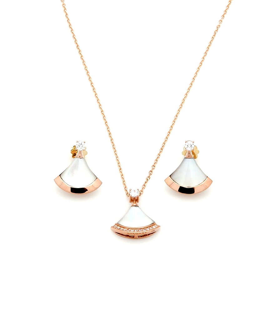 여성적인 우아함과 매혹적인 감성으로 섬세한 페미니티의 정수를 표현한 목걸이와 귀걸이는 마더오브펄의 대리석 느낌을 지닌 장식의 부채 모티브가 만들어내는 감각적인 곡선이 조화를 이루며 아름다움의 본질을 담아낸 디자인입니다.