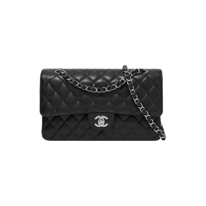 클래식 미디움 플랩백 그레인드 카프스킨 & 실버 메탈 블랙 샤O